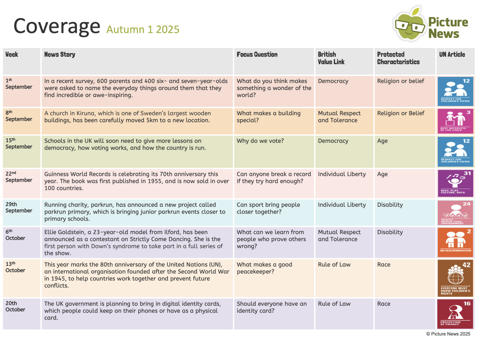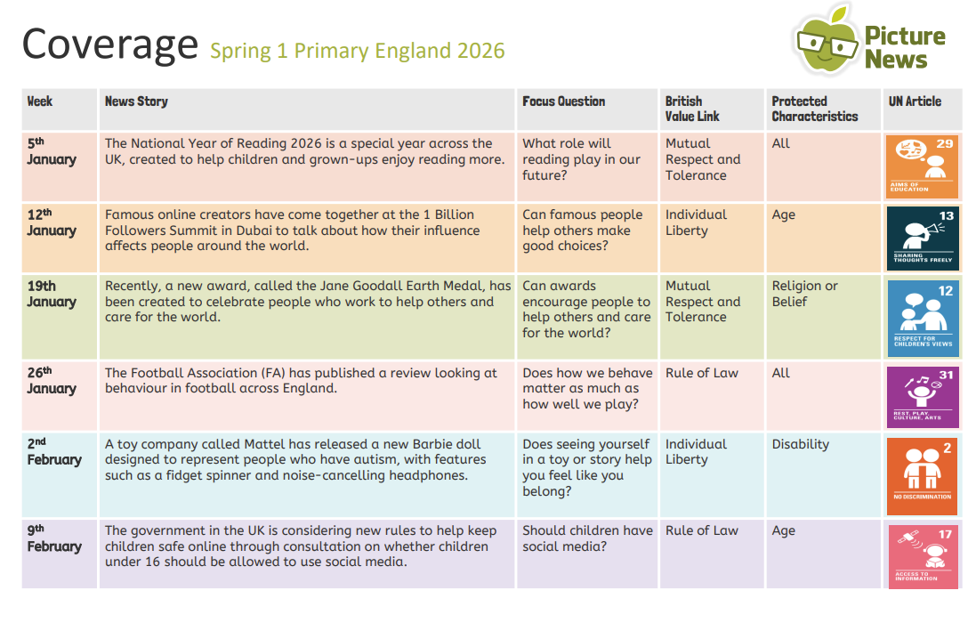 At Brambles Primary Academy, we weekly read and discuss 'Picture News'. Picture News enables us to develop our social, moral, social and cultural elements of our learning. It teaches us about current affairs and allows us to see more clearly into the wider community and world around us.